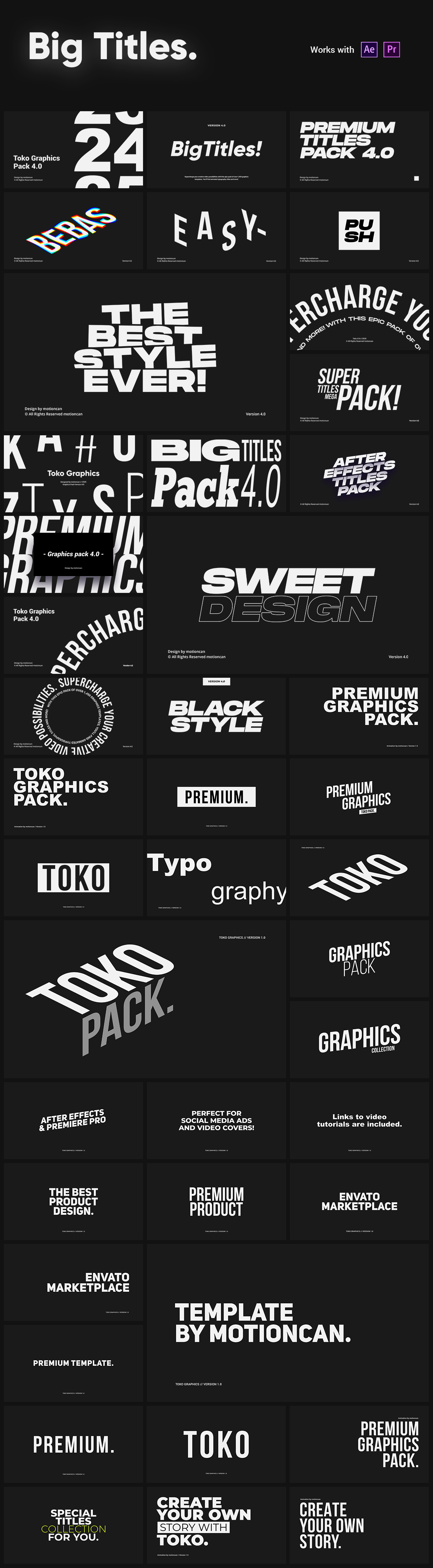 Buy graphics pack for premiere pro by motioncan on videohive. Additional in/out feature for premiere pro! • toko graphics (after effects files) • toko graphics (premiere pro files) • html library • helpfile. Improved auto resize to some aspect ratio. If you want to use toko graphics pack in premiere pro through the motion bro extension, you need this version. After effects and premiere pro support. • added function to change fonts directly in premiere. Toko graphics 3.0 product information. Supported any resolution up to 4k. 1450+ ready for use graphics elements. Toko graphics tutorial how to use in premiere pro mogrts. Toko graphics 4.0 product information 2250+ ready for use graphics elements after effects cc 2018 and above premiere pro cc 2021 and above 600 sound fx included after effects if you want to use toko graphics pack in premiere pro through the motion bro extension, you need this version. Changelog + added support for premiere pro cc 2019.