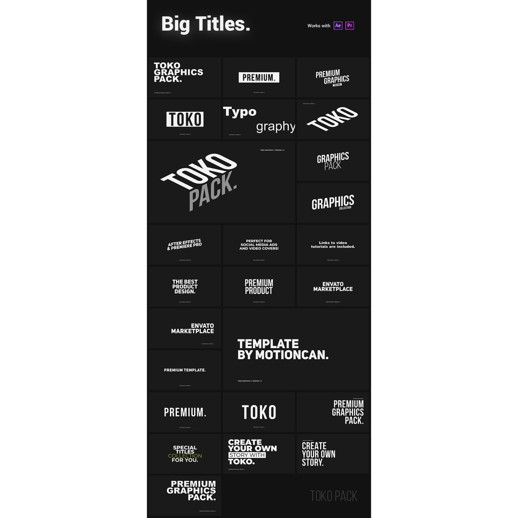 After effects cc.2014.2 and above. Toko graphics 3.0 product information. 1450+ ready for use graphics elements. 80+ free graphics elements (titles, typography, glitch elements, backgrounds, transitions, logo reveals, gradients, icons, shape lines, social media). Additional in/out feature for premiere pro!